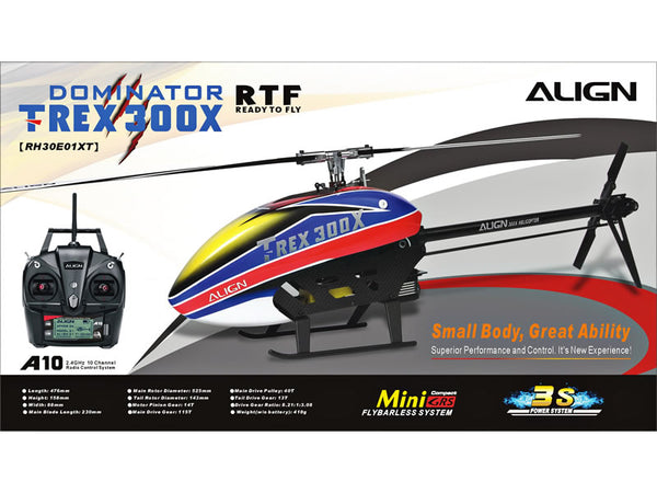 Align newly designed T-Rex 300X, small but all-in-perfect. It adopts DFC rotor head unit, low CG and low wind resistance providing direct flight responses. The carbon fiber main frame is made of composite material and with reinforcement plate and brace assembly effectively enhancing structural intensity and torsion resistance. Narrow body design makes mechanical structure much stronger. The battery slider and top-mounted motor design with anodized bright red color brings pretty texture on this model. Thicken aluminum alloy tail boom for the best torsion resistance and increase the tail support rod lifetime. The progressive lightweight landing skid making this model the leader in this class. Plus the fiberglass painted canopy features lightweight and low in wind resistance.